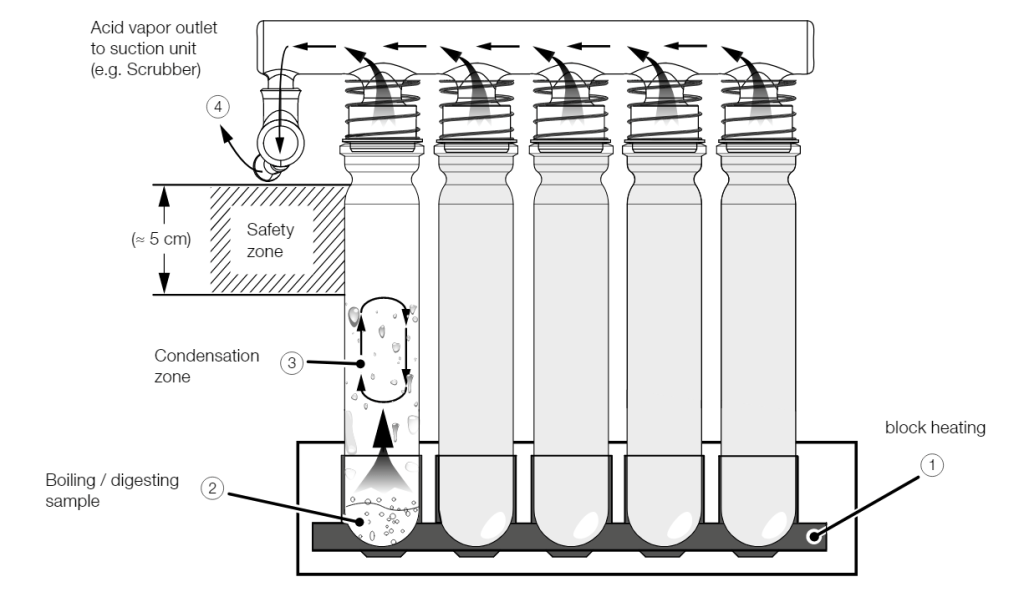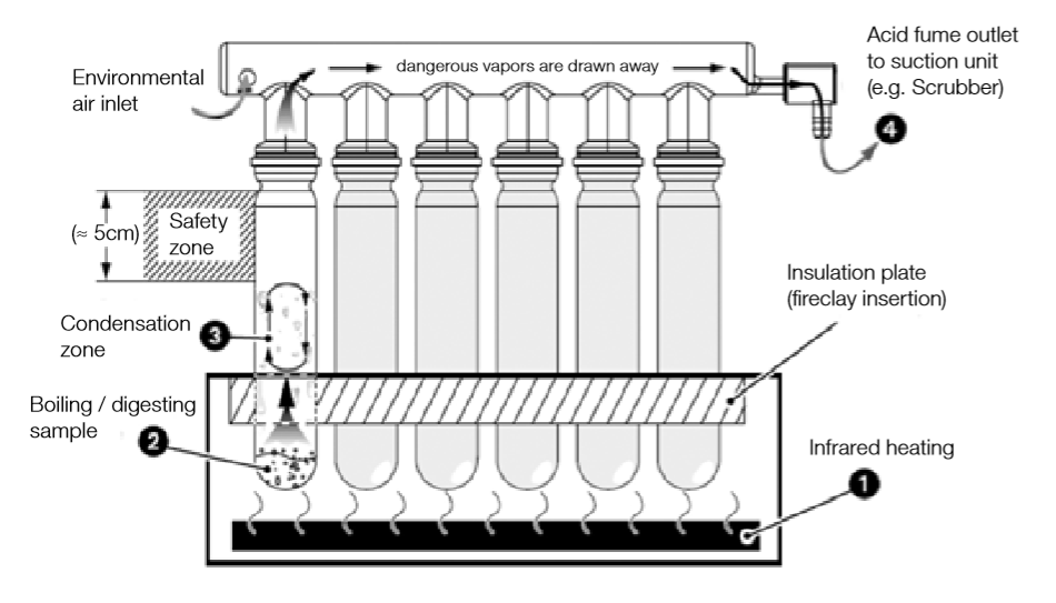 The infrared heating (1) generates high temperatures in the sample (2). The sample is digested in constantly boiling acid. Hot acid fumes rise into the condensation zone (3), condense and rinse back down to the sample, creating a constant reflux. Residual fumes which escape the condensation zone is highly corrosive and must be withdrawn and efficiently neutralized (i.e. with the Scrubber K-415).