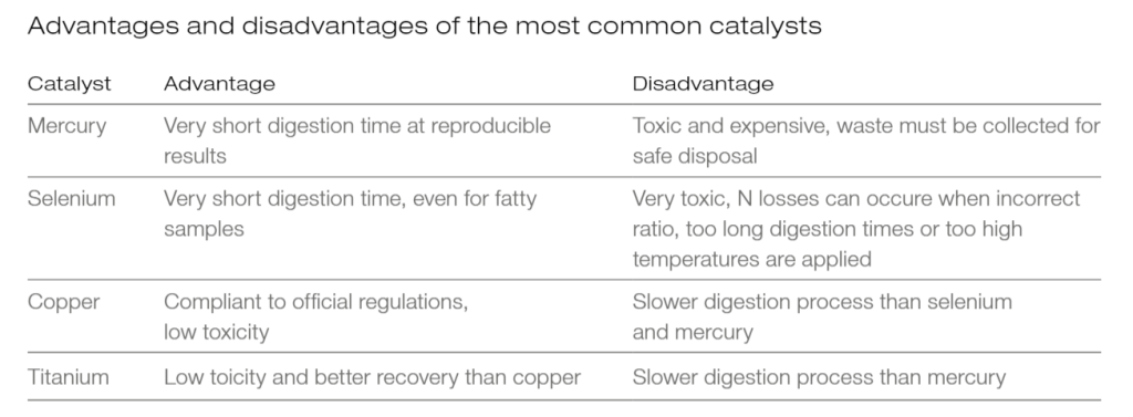 In Johan Kjeldahl’s original procedure, digestion was carried out in boiling sulfuric acid, and oxidation was supported by the addition of potassium permanganate, a strong oxidizing agent. Now, scientists use salts (e.g. potassium sulfate) and catalysts or hydrogen peroxide, which further speed up digestion. Selenium and metal salts, particularly mercury, copper or titanium, are common catalysts today.