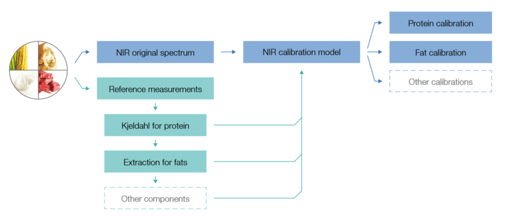 This blog has made many mentions to the fact that near-infrared (NIR) spectroscopy is a secondary method. That means that NIR doesn’t measure things like moisture, fat, protein, ash, %-polymerization or anything else directly. Instead, we use an acceptable primary method, like Kjeldahl, to produce reference data (i.e. %-protein) that gets assigned to a sample that we have NIR spectra of. Then, we use a set of samples that have both an NIR spectrum and reference measurement data to train the NIR to make those measurements for us in the future via a calibration. Once the calibration is developed, we can take a routine sample (e.g. ground meat) and measure the protein content in a matter of seconds. Another benefit of NIR is the ability to measure all calibrated properties simultaneously, as illustrated in the flow chart below. More details on calibration can be found in this earlier blog post.