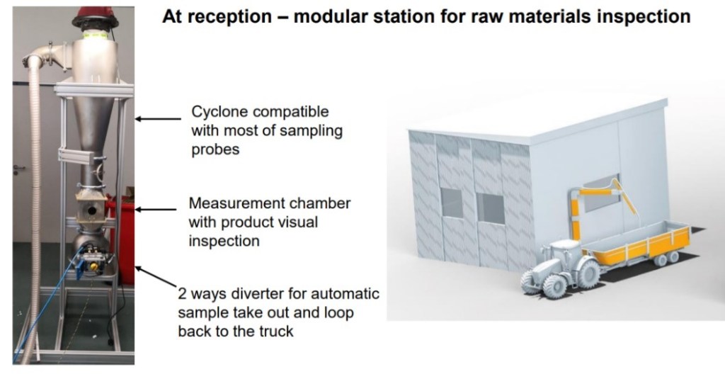 Installation of the analyzer right before the silo allows for segregation of incoming goods. Results can be automatically transferred to a process control system to activate the correct valve for the bin and to adjust for variations of protein content during unloading. The raw material intake, grain composition, and quality are monitored and documented. This all serves to improve the efficiency of subsequent blending steps.