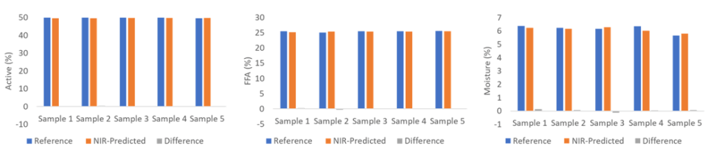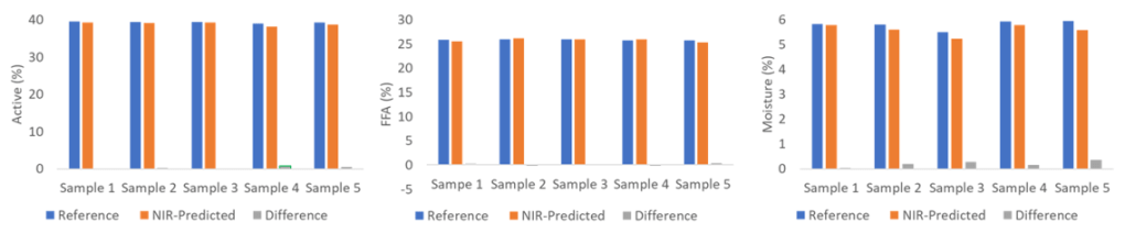 Samples spanning a four-hour production run were analyzed by NIR then subsequently compared to wet chemistry reference data. The accuracy of the ProxiMateTM NIR predictions for all three variables: active ingredient (%), FFA (%), and moisture (%), is illustrated for both Formulations A (Figure 2) and B (Figure 3). The minimal difference between reference and predicted values illustrates the prediction accuracy for all three calibration models.
