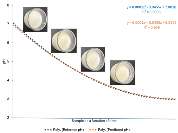 Replotting and trending the calibration data recreates the pH profile throughout the lactic acid fermentation of milk into yogurt (Figure 4). The reference pH trend closely follows the predicted pH trend.