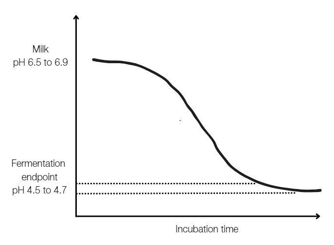 During fermentation, lactic acid bacteria convert lactose into lactic acid, lowering the pH to approximately 4.5 to 4.7 (Figure 1). The fermentation process is deemed complete when the pH stabilizes within this range. Periodic checks are required to ensure the yogurt has the desired consistency and flavor. At the fermentation end-point yogurt is cooled to around 4°C (39°F) to stop the fermentation process and stabilize the product.