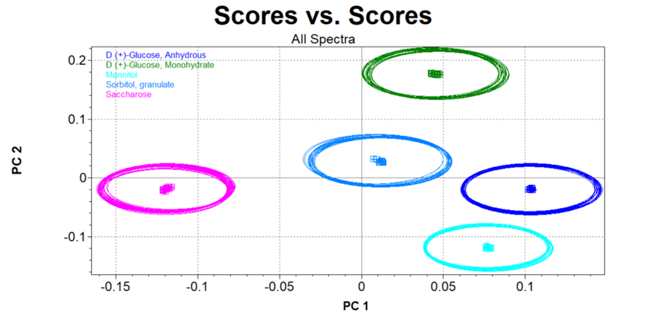 For instance, let’s consider a sugar cluster, with five different types of sugar: D(+) Glucose, Anhydrous, D(+) Glucose, Monohydrate, Mannitol, Sorbitol, and Saccharose. At first glance, these sugars look quite similar and might even taste alike. But chemically, they are distinct, and NIR – with the right model – can differentiate them. Identifying each of these sugars with reference laboratory methods would require complex laboratory methods, which could take hours or even days – resulting in costly delays.